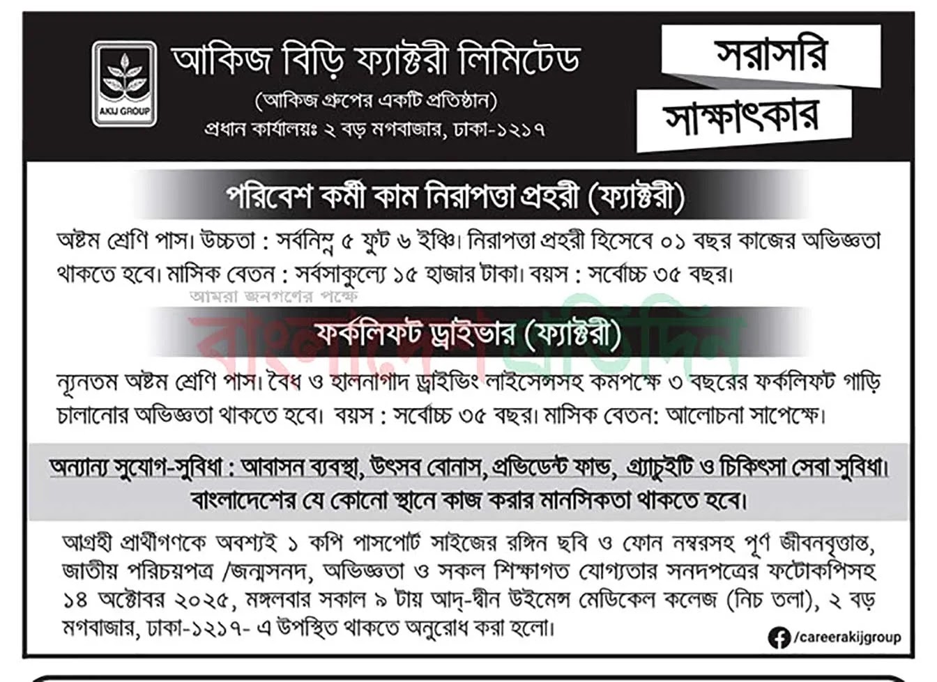Akij Biri Factory Job Circular 2025 was printed on 09 October 2025. The submit names are given beneath. Only on-line functions for the Akij Biri Factory Job Circular 2025 can be accepted. The official job utility deadline is 14 October 2025.