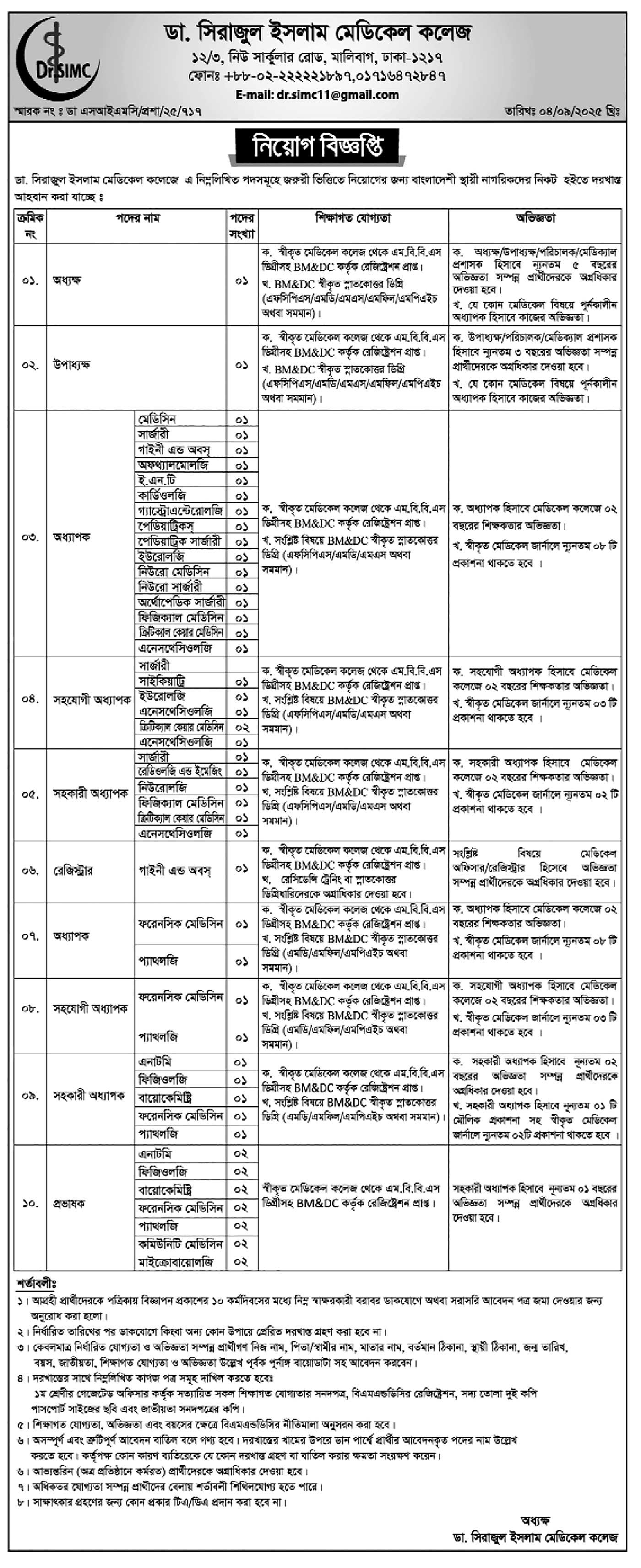 Dr. Sirajul Islam Medical College Job Circular 2025