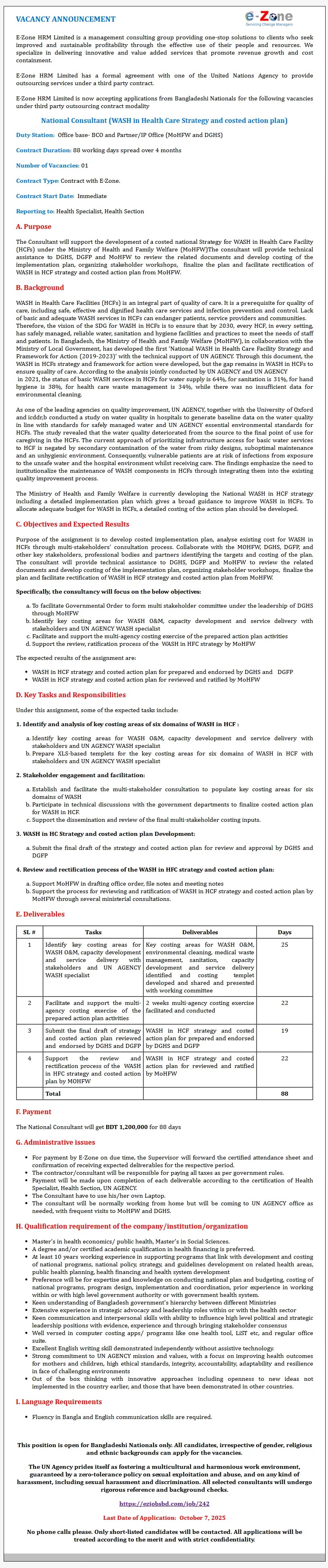 E-Zone HRM Limited Job Circular 2025 has been introduced on 04 October 2025. The whole man emptiness is just not particular. The publish title is “National Consultant (WASH in Health Care Strategy and costed motion plan)“. Only on-line purposes shall be accepted for this E-Zone HRM Limited Job Circular 2025. The official job software deadline is 07 October 2025.