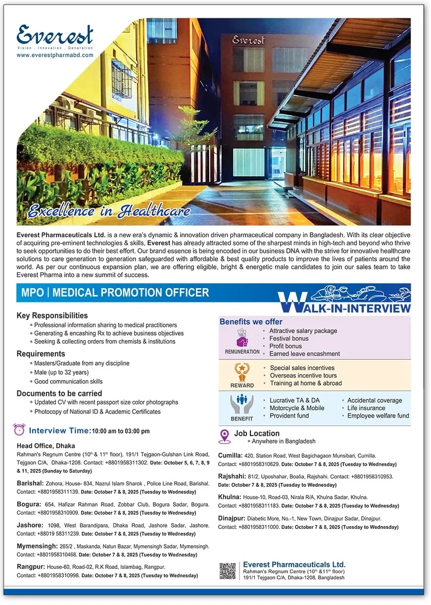 Everest Pharmaceuticals Ltd Job Circular 2025 was revealed on 04 October 2025. The put up title is “Medical Promotion Officer“. The jo software methodology is just a walk-in interview. The walk-in interview instances are 07 & 08 October 2025.