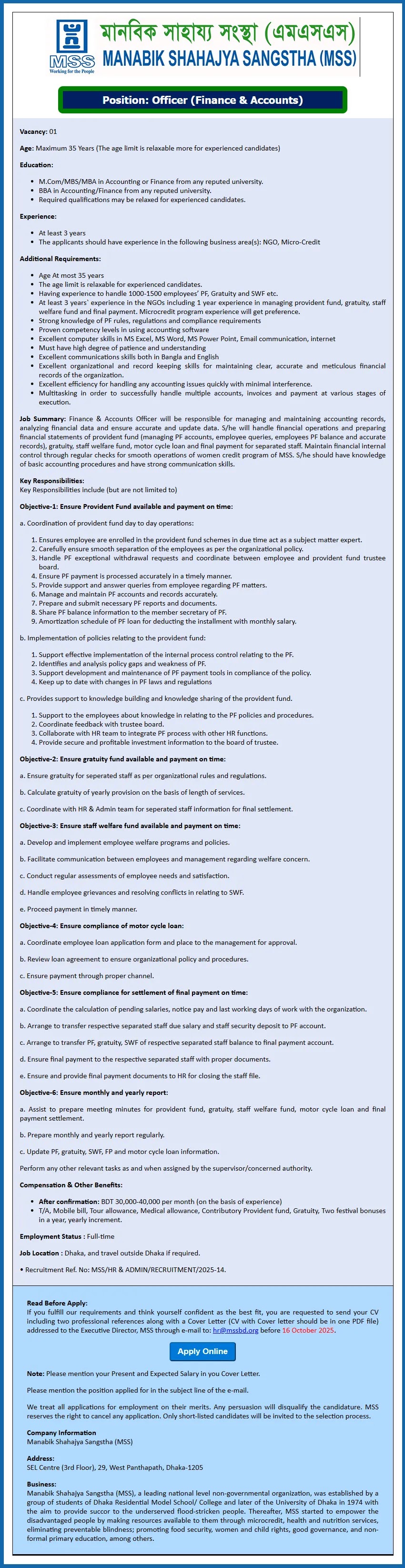 Manabik Shahajya Sangstha Job Circular 2025 has been introduced on 04 October 2025. The complete man emptiness is 50. The put up identify is “Officer (Finance & Accounts)“. Only on-line functions will likely be accepted for this Manabik Shahajya Sangstha Job Circular 2025. The official job software deadline is 16 October 2025.