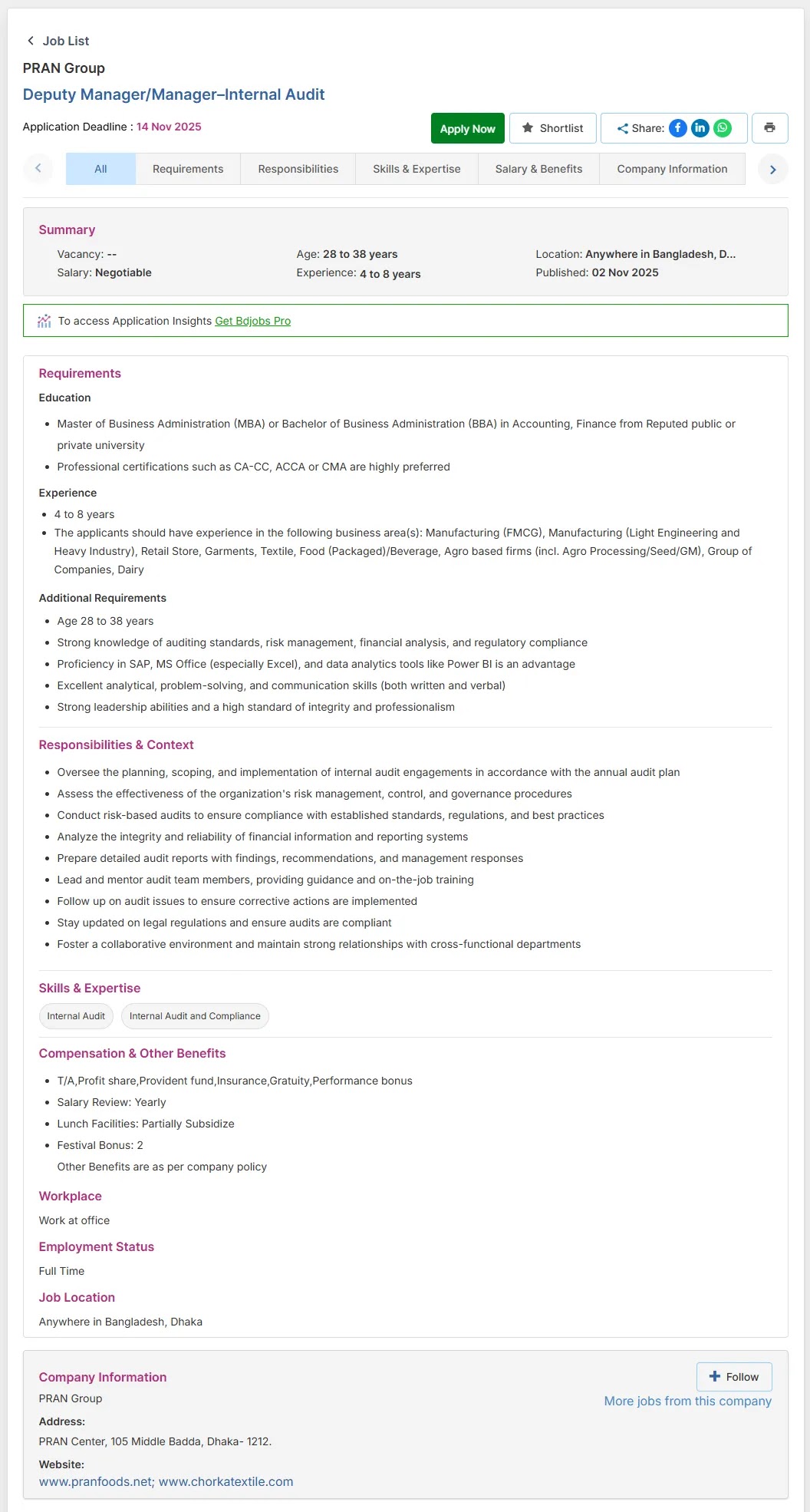 The Pran Group Job Circular 2025 was introduced on 04 November 2025. The complete emptiness is 300. The put up title is “Deputy Manager/Manager–Internal Audit“. Only on-line purposes will likely be accepted for this Pran Group Job Circular 2025. The official job utility deadline is 14 November 2025.