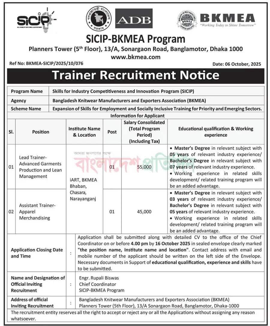 Skills for Industry Competitiveness and Innovation Program SICIP Job Circular 2025 was revealed on 18 September & 07 2025. The revealed sources are www.sicip.gov.bd & The Daily E-Paper. The SICIP will settle for its utility solely via the submit workplace. The job utility deadlines are 10 & 16 October 2025.